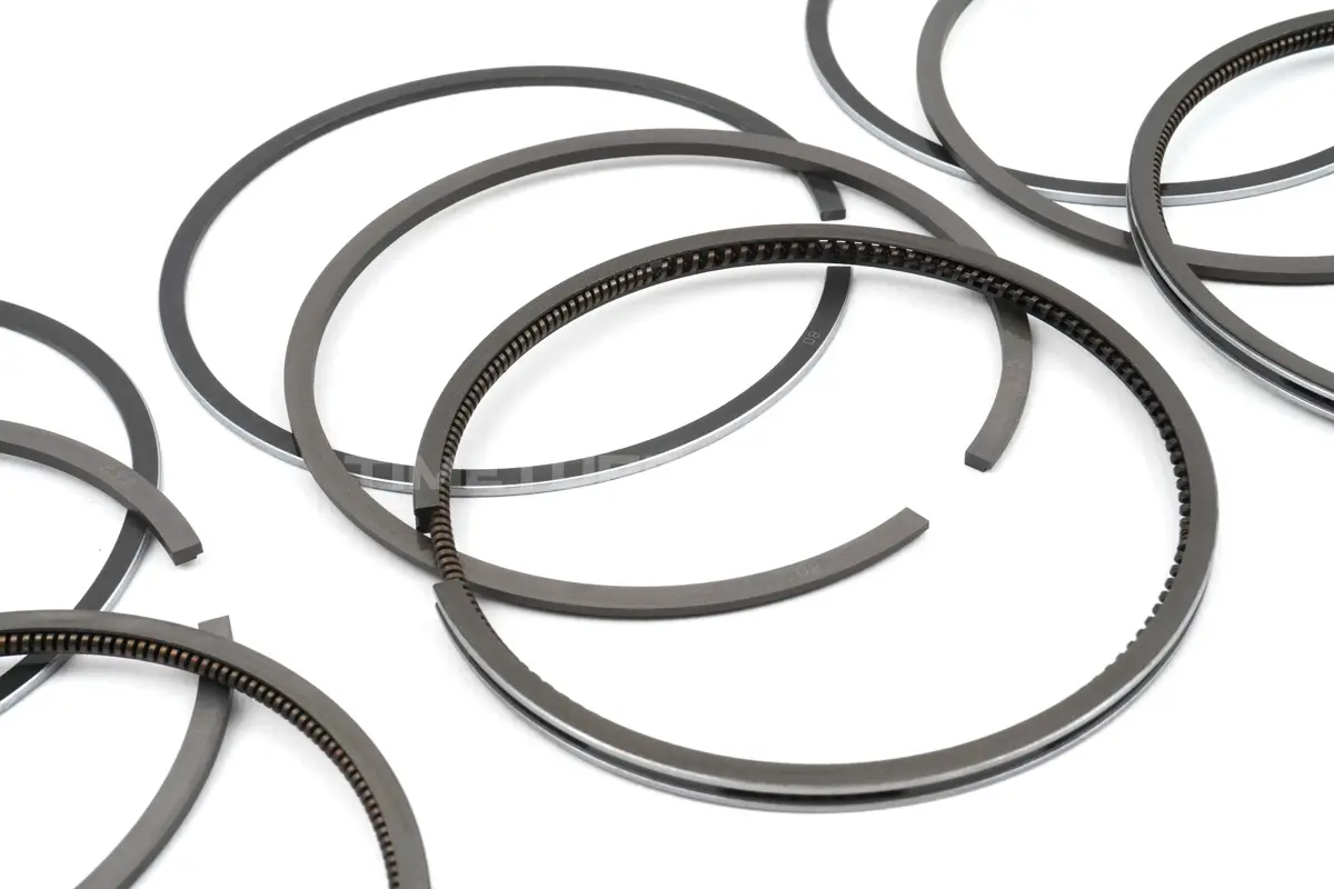 Поршневые кольца являются кольцами незамкнутого типа, которые с минимальным зазором устанавливаются в специальные канавки, находящиеся на внешней стороне поршней. Они служат в качестве уплотнительного элемента, благодаря которому достигается необходимая степень герметичности камеры сгорания. В современных двигателях используются 3 поршневых кольца - 2 компрессионных (они обеспечивают скользящее герметичное соединение) и 1 маслосъёмное (они регулируют количество масла на стенках цилиндра). Компрессионные кольца не позволяют отработавшим газам в избыточном количестве попадать в картер, а маслосъёмное, в свою очередь, не позволяет маслу из картера двигателя попадать в камеру сгорания. Кроме того, поршневые кольца дополнительно охлаждают поршни, так как отводят часть тепла от них на стенки цилиндров.