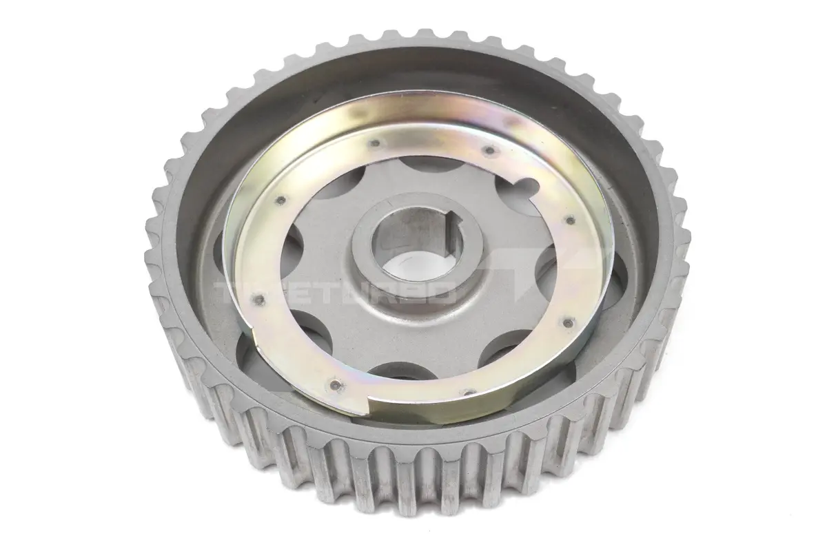 Шкив распредвала - это деталь привода газораспределительного механизма двигателя. Это зубчатый шкив, который вращается зубчатым шкивом коленвала через зубчатый ремень. В некоторых шкивах есть возможность изменения положения распредвала (центральной части шкива) относительно внешней части шкива где происходит зацепление зубьев шкива с зубьями ремня. Это может быть фиксированная настройка (разрезная шестерня) или муфта с гидравлическим или электрическим управлением.