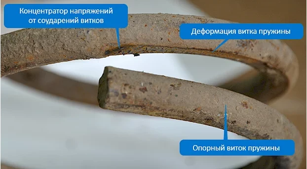 При проезде автомобиля по неровностям дороги происходит сжатие пружин и постоянное соударение опорного витка со следующим за ним витком. В результате такого соударения появляются стуки, нарушается покрытие пружины, что приводит к образованию на ней коррозии и постепенной усадке. Также в результате длительного соударения витков происходит их деформация, образуется концентратор напряжений, который приводит к отлому опорного витка.
