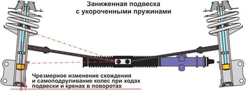 При занижении автомобиля с помощью пружин без замены штатных амортизаторов кузов опускается на величину занижения, а вместе с ним опускается рулевой механизм. Концы рулевых тяг остаются на прежней высоте относительно земли, следовательно, тяги встают под углом. При ходах такой подвески и при прохождении поворотов с креном происходит еще большее отклонение рулевых тяг. При этом схождение изменяется сильнее, чем на штатной подвеске, и появляется необходимость увеличивать движение руля в сторону поворота.