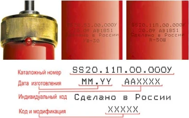 Маркировка на корпусе амортизаторной Стойки передние выполнена ударно-точечным способом и включает: каталожный номер, дату изготовления, индивидуальный номер и код модификации.