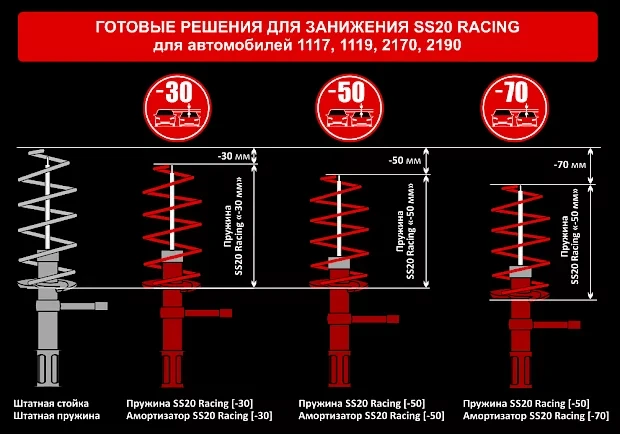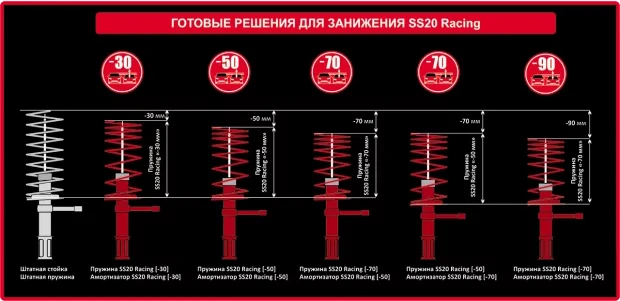 Помимо заниженных амортизаторов, компания SS20 производит Стойки передние и амортизаторы для а/м ВАЗ четырех модификаций по степени жесткости: «Стандарт», «Комфорт-ОПТИМА», «Шоссе» и «Спорт», что позволяет каждому водителю выбрать наилучшее сочетание комфорта и управляемости.